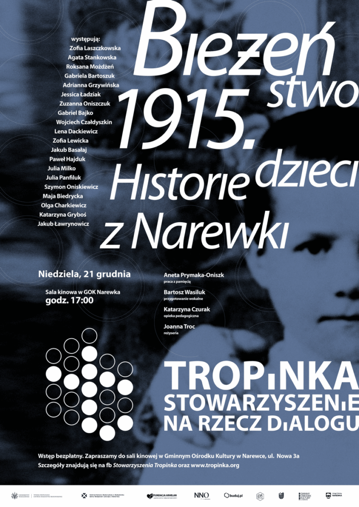 „Bieżeństwo 1915. Historie dzieci z Narewki” – spektakl teatralny Pokaz filmu „Doktor” Poezja w Puszczy – 6. edycja – 2025 Międzynarodowe Rezydencje Twórcze 2025 2024 – Otwarcie wystawy – Bieżeństwo 1915. Zapomniane uchodźstwo Premiera książki poetyckiej Julii Fiedorczuk „Glif” Pokaz filmu „Drobny kruchy człowiek” Premiera książki poetyckiej Julii Fiedorczuk „Glif” Poezja w Puszczy – 5. edycja – 2024 Pan Les Wystawa Faustyna Drużyckiego „Teren typu bagno.” Biodróż Międzynarodowe Rezydencje Twórcze 2024 BERJOZKELE – koncert Oli Bilińskiej – 2023 Spotkanie z Adamem Wajrakiem – 2023 Spotkanie z Julią Fiedorczuk – 2023 Poezja w Puszczy – 4. edycja – 2023 Międzynarodowe Rezydencje Twórcze 2023 Ukraińskie Rezydencje Twórcze 2022 Rezydencje Twórcze 2022 2021 – Wystawa „Sąsiedzi, których już nie ma…” Rezydencje Twórcze 2021 Filmowe Podlasie oraz koncert Postmana Narewka czyta Olgę Tokarczuk Spotkania na Granicy: Dzień Szwedzki Poezja w Puszczy – 3. edycja – 2019 Spotkania na Granicy: Dzień Tatarski Szkolenie: inwentaryzacja alei Chór Przyjechał Zielony Kwiecień 2019 Spotkania na Granicy: Dzień Gruziński Poezja w Puszczy – 2 edycja Spotkania na Granicy: Dzień Szwajcarski Porządkowanie kirkutu Szkolenie „Aleje: Wartość oraz szansa rozwoju“ Spotkania na Tropince: Poezja w Puszczy i Bieżeństwo – 2017 Zielony Kwiecień Białowieskie Dni Kultury Pokoju 11-13 sierpnia Spotkania na Granicy: Dzień Białoruski Koncert Zmiciera Wajciuszkiewicza TODARA Monodram Joanny Troc: “Ksenia” Warsztaty: Pamiętajmy o ogrodach Spotkania na Granicy: Dzień Ukraiński Inauguracja działalności Tropinki