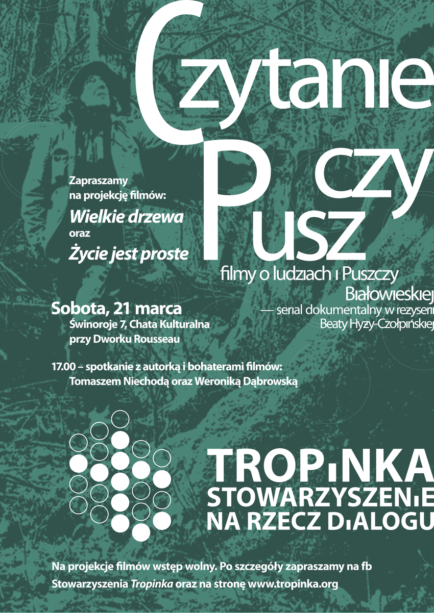 W 2026 roku kontynuujemy spotkania z bohaterami oraz Beatą Hyży-Czołpińską, autorką filmowej serii pt. „Czytanie Puszczy – filmy o Puszczy i ludziach“. Miejscem spotkań i projekcji jest Chata Kulturalna przy Dworku Rousseau (Świnoroje 7).