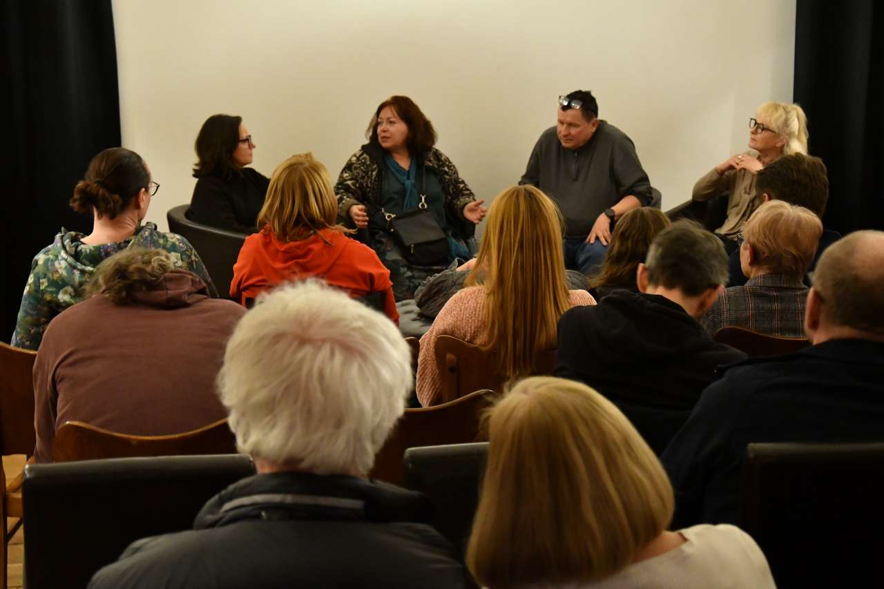 I tak – od obejrzanych przed chwilą filmów – zaczęła się niezwykle interesująca rozmowa o wielu aspektach Puszczy Białowieskiej, o jej różnych obliczach – od fizycznych do duchowych. O jej przeszłości i przyszłości. Wiemy np. jak za 500 lat będzie wyglądał dąb, mierzony dziś przez Tomka Niechodę, ale jaka będzie wtedy nasza, ludzka rzeczywistość? Czy można uciec od siebie, od swoich problemów do Puszczy? A może to właśnie w Puszczy uciekamy „do siebie”? Rozmawialiśmy o tym, że las niweluje rozmaite hierarchie, które towarzyszą naszemu życiu. Były też momenty humorystyczne – Tomek zapytany o to, co się zmieniło w jego życiu od momentu realizacji filmu powiedział, że ubył mu 1 ząb. „Znowu liczba!” – zauważyła prowadząca. Na co pytany odpowiedział, że w wypadku zęba taka liczba jest zdecydowanie lepsza, niż np. cztery.
